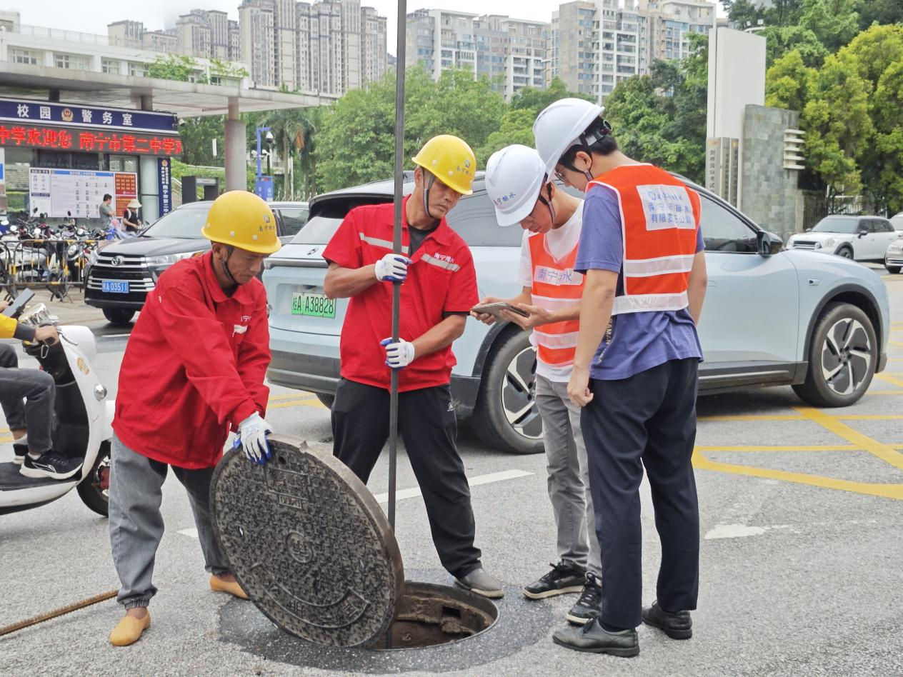 市排水公司工作人員對考場(chǎng)周邊井蓋進(jìn)行巡查養護
