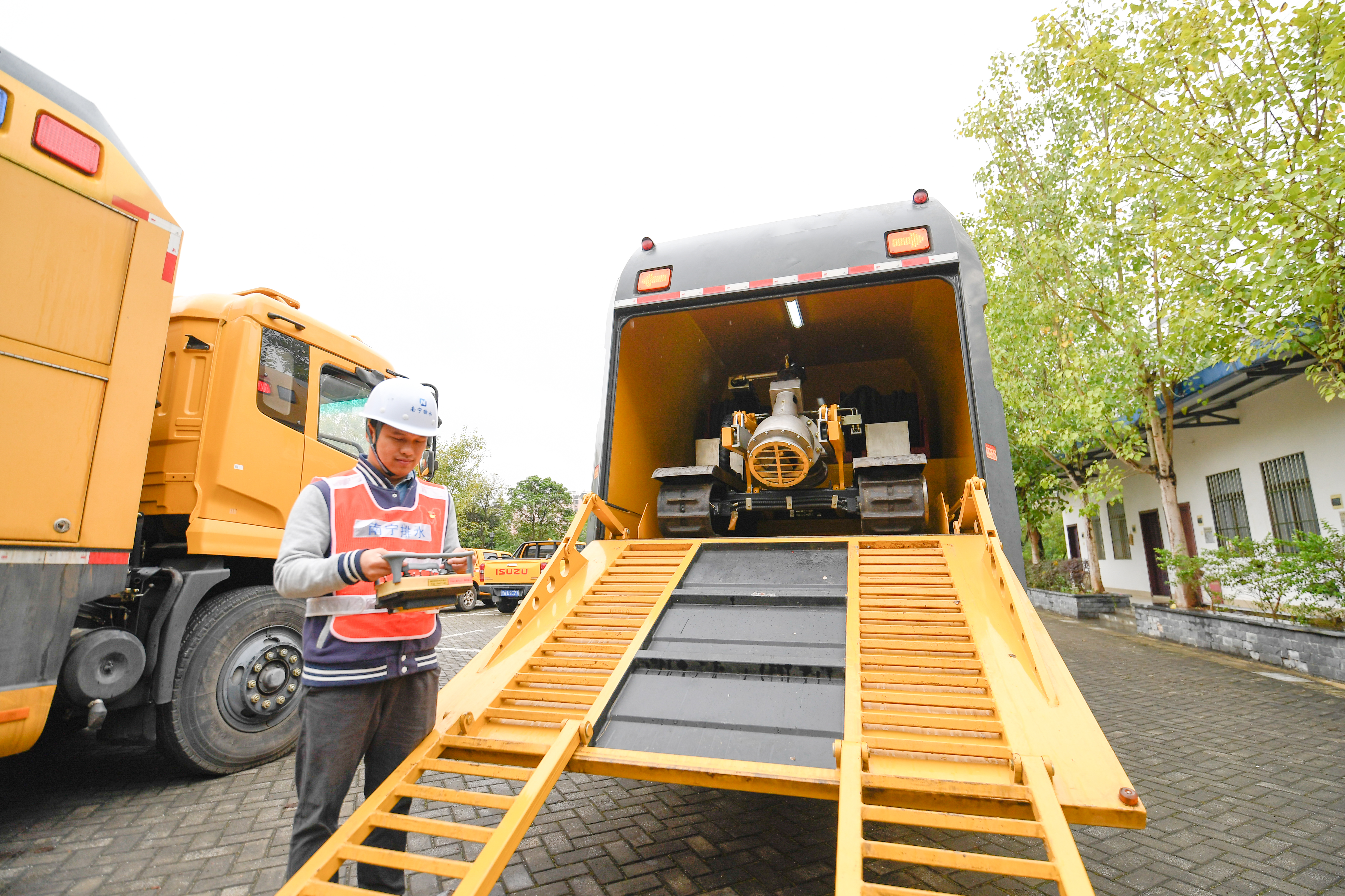 在市排水公司三美運維基地,工作人員在對防汛車(chē)輛進(jìn)行設備檢查。