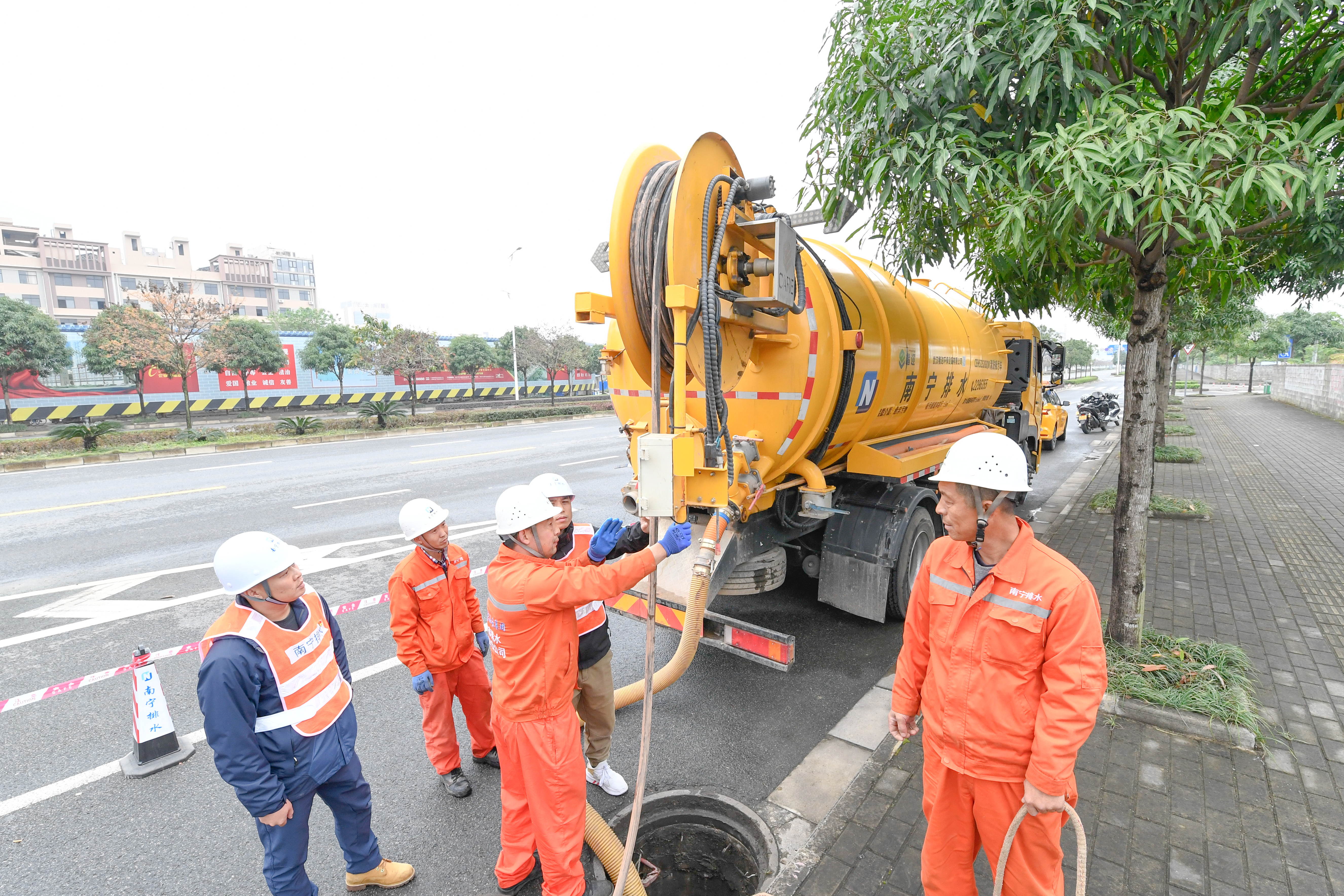 市政道路上,工作人員正對排水管道進(jìn)行清淤疏通。